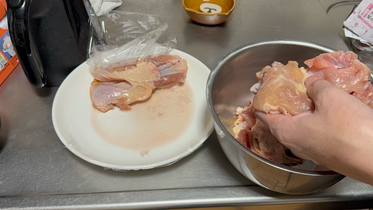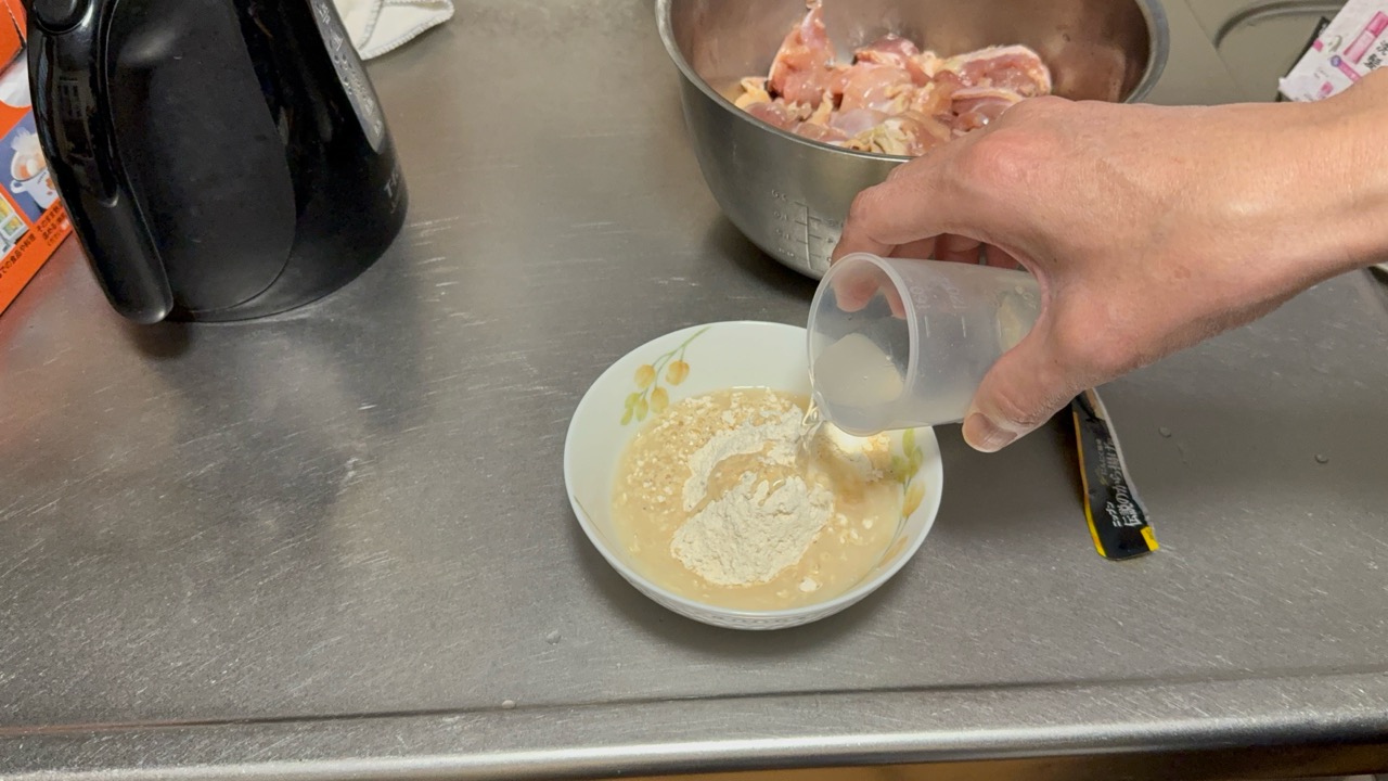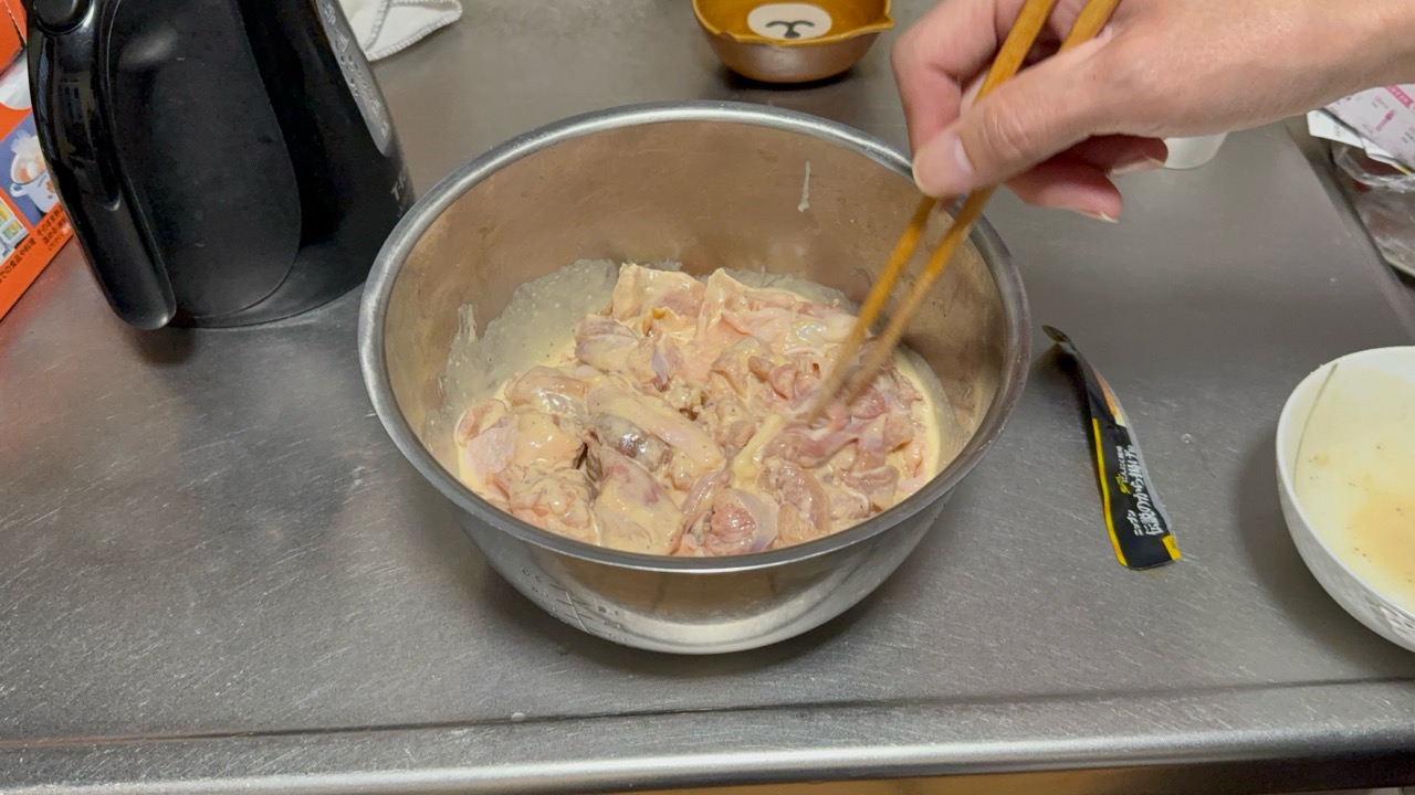 唐揚げ粉を溶いて、混ぜる。そして放置して味を染み渡らせます。