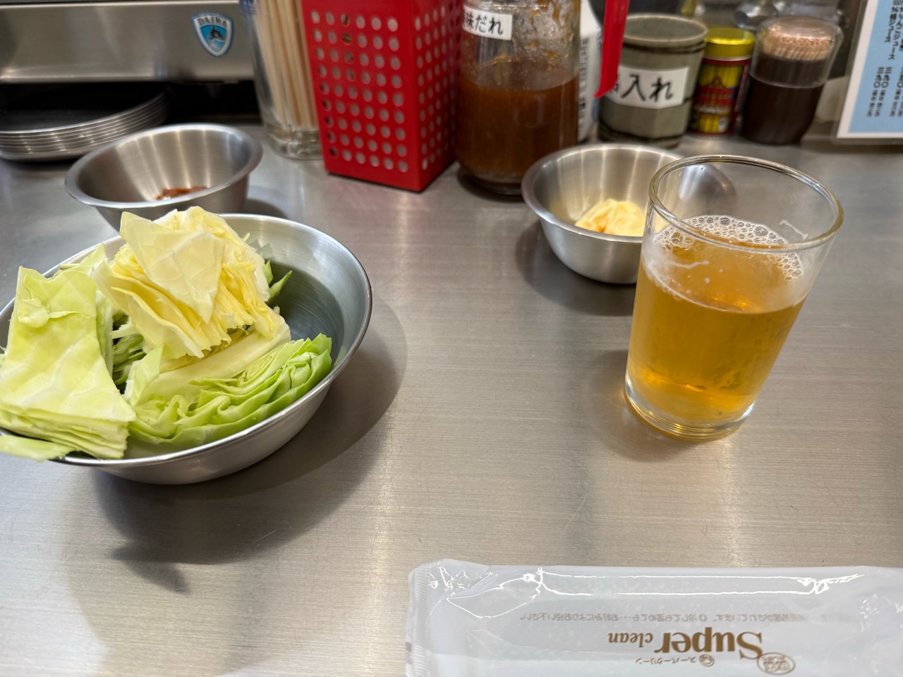 お通しはキャベツでした。味噌とマヨネーズをつけて食べますが、味噌が美味しい。隠し味がたくさん入ってそうです。